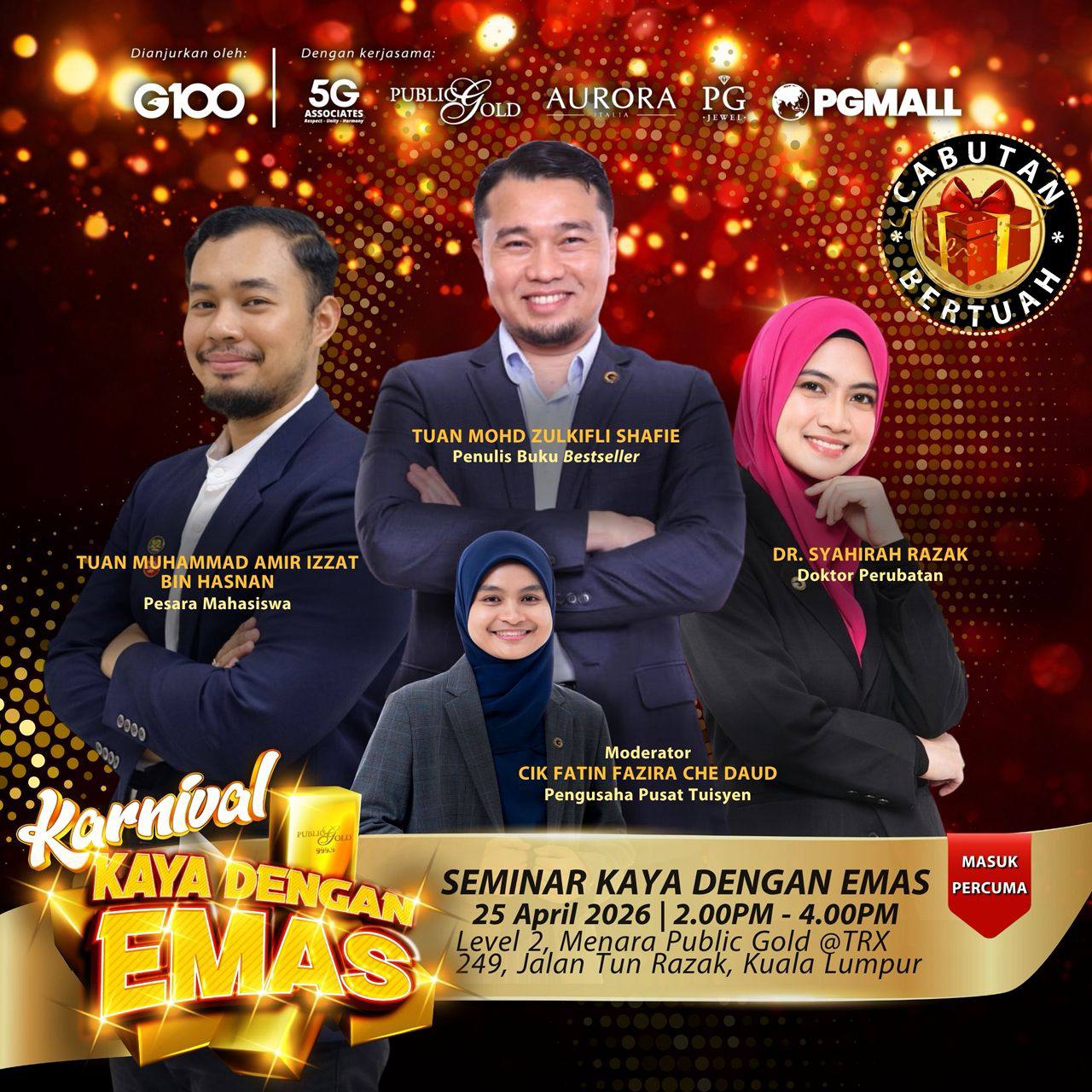 Penyertaan percuma. Terhad 100 pendaftaran pertama. Cabutan bertuah dan promosi (firesales) emas juga disediakan. Sila datang awal untuk dapatkan seat selesa. Seminar akan bermula tepat 3:00 petang